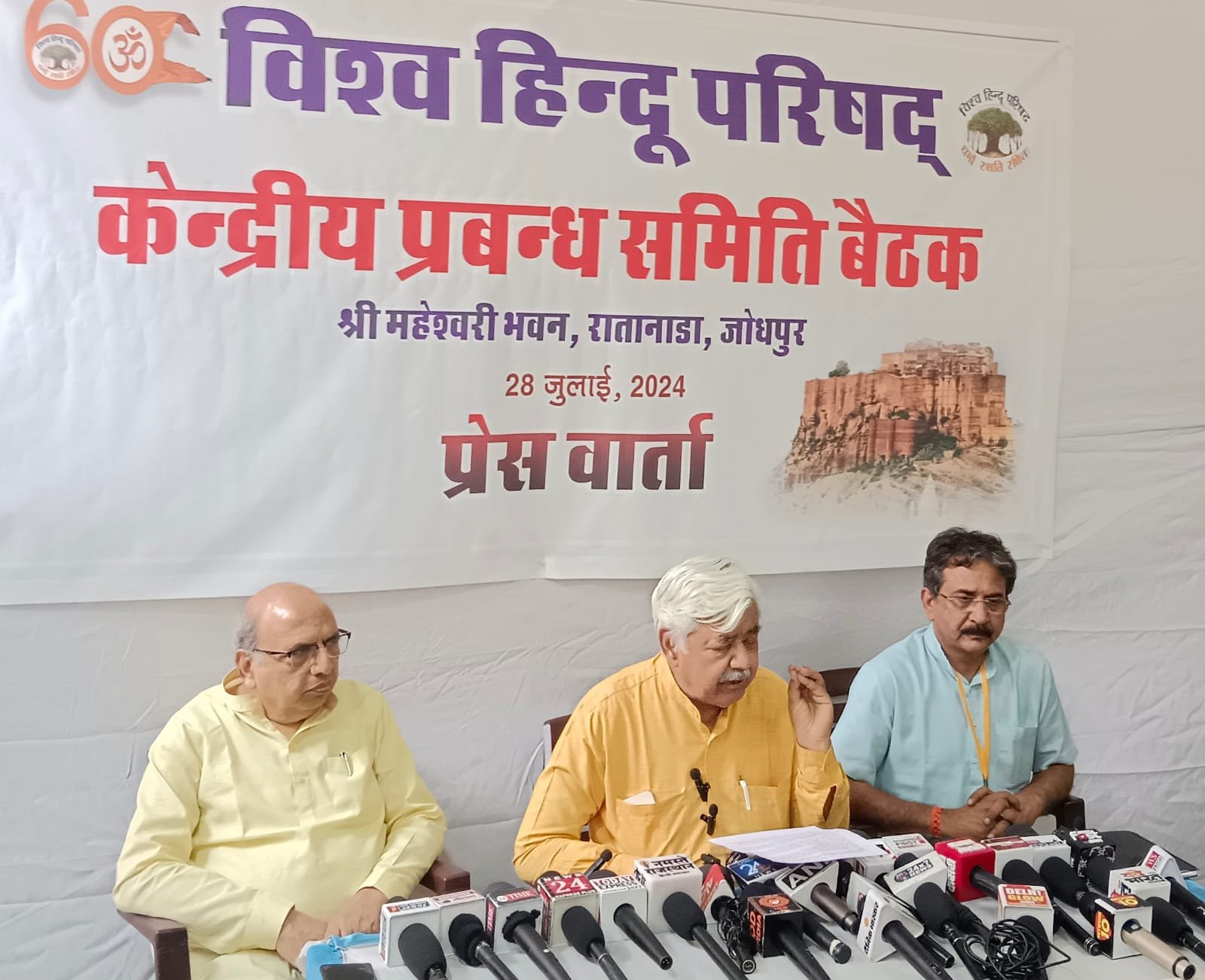 जोधपुर, 28 जुलाई 2024 विश्व हिन्दू परिषद की केन्द्रीय प्रबन्ध समिति की दो दिवसीय बैठक जोधपुर के माहेश्वरी भवन में सम्पन्न हुई। रविवार को बैठक की सम्पूर्ण जानकारी के लिए हुई पत्रकार वार्ता को विहिप के राष्ट्रीय अध्यक्ष व वरिष्ठ अधिवक्ता श्री आलोक कुमार ने सम्बोधित करते हुए कहा कि बैठक में प्रत्येक विस्थापित हिन्दू को नागरिकता मिले, हिन्दू मान्यताओं व परम्पराओं की सात्विकता व पवित्रता सुनिश्चित करने के साथ, मन्दिरों को जागरण, धर्म प्रचार, सेवा व समरसता के केन्द्र बनाने का संकल्प लिया गया।