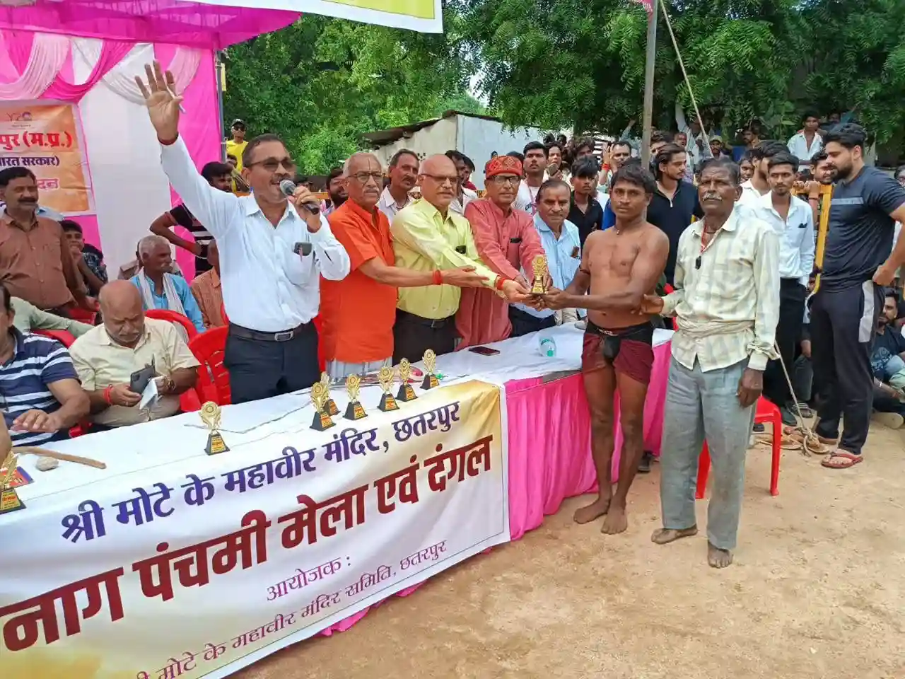 श्री मोटे के महावीर मंदिर समिति छतरपुर के तत्वावधान में आज नाग पंचमी के शुभ अवसर पर दंगल एवं मलखंब प्रतियोगिता का पारंपरिक आयोजन संपन्न हुआ जिसमें लगभग 50 से अधिक पहलवानों ने शानदार कुश्ती का प्रदर्शन किया एवं मलखंब संगठन छतरपुर के जिला अध्यक्ष श्री प्रदीप सेन कोच सौरभ कुशवाहा की मलखंब की टीम द्वारा शानदार प्रदर्शन करते हुए पुरस्कार प्राप्त किया कार्यक्रम के अतिथि के रूप में छतरपुर विधायक माननीय श्रीमती ललिता यादव जी एवं अतिरिक्त सत्र न्यायाधीश सचिव श्री अनिल चौधरी विधिक सहायता एवं श्री हेमंत कुशवाह विधिक सहायता अधिकारी महोदय जी के कर कमल से पुरस्कार प्रदान किए गए, श्री मोटे के महावीर मंदिर समिति के सम्माननीय अध्यक्ष श्री विनोद रावत श्री मान सिंह सर श्री देवेंद्र भंडारी श्रीमान शंकर सोनी समाजसेवी सहित बसंत पाठक भवानी प्रसाद त्रिपाठी नरेंद्र चतुर्वेदी शैलेंद्र सिंह एडवोकेट देव नाथ जी पाठक श्री पंकज पाठक राकेश शर्मा अभिनेंद्र खरे कवि राघवेंद्र पटेल प्रमोद राजपूत भैया पाठक सदस्य गण व्यवस्था में विशेष सक्रिय रहे ।