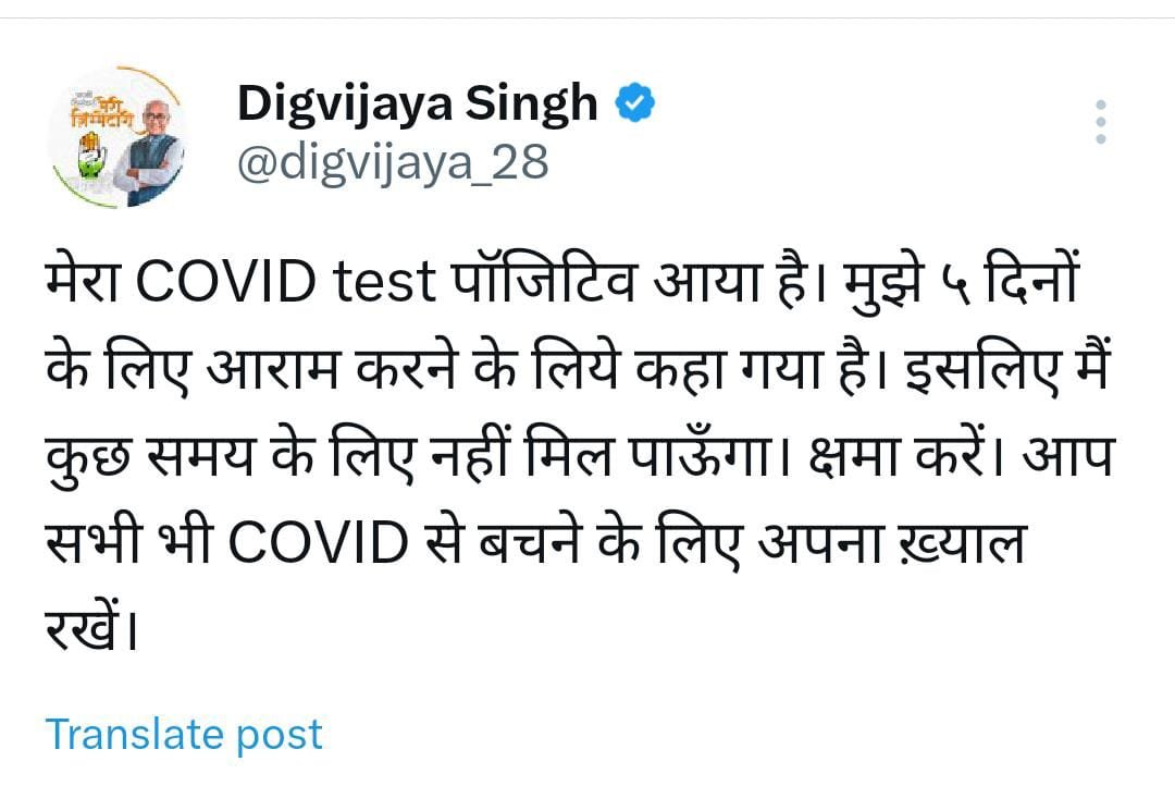 पूर्व सीएम दिग्विजय सिंह ने एक्स पर लिखा, मेरा COVID टेस्ट पॉजिटिव आया है। मुझे 5 दिनों के लिए आराम करने के लिए कहा गया है। इसलिए मैं कुछ समय के लिए नहीं मिल पाऊंगा। क्षमा करें। आप सभी भी COVID से बचने के लिए अपना ख्याल रखें।