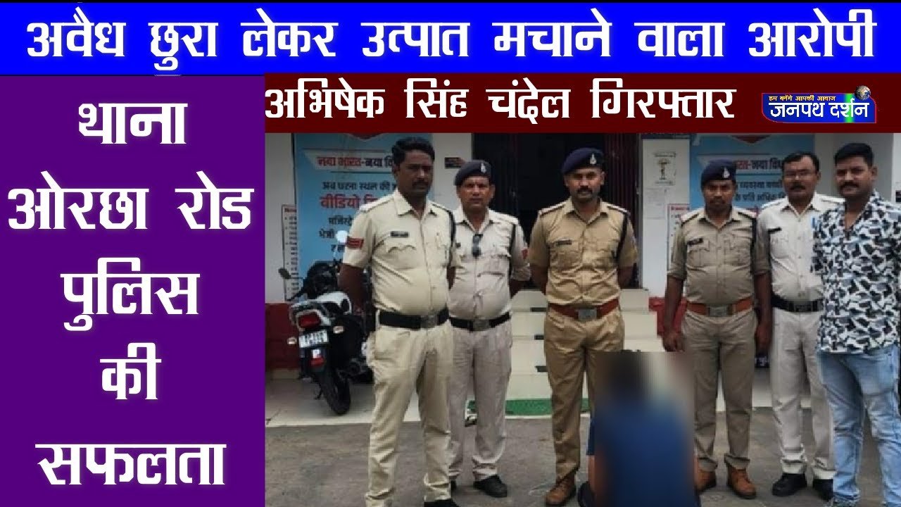 थाना ओरछा रोड पुलिस को विगत दिवस भ्रमण के दौरान ट्रांसपोर्ट नगर तिराहे नौगांव रोड पर भय व्याप्त करने की मंशा से एक लोहे के छुरा लेकर उत्पात मचा रहे व्यक्ति की सूचना मिली। पुलिस टीम त्वरित कार्यवाही करते हुए मौके पर पहुंची, पुलिस को आता देख संदेही ने भागने का प्रयास किया, घेराबंदी कर व्यक्ति को पकड़ा गया। सावधानी पूर्वक लोहे का छुरा जप्त किया गया। पूछताछ पर नाम अभिषेक सिंह चंदेल पिता स्व. श्री खिलावन सिंह चंदेल उम्र 19 वर्ष निवासी ग्राम देरी छतरपुर का होना बताया। लोहे का छुरा खतरनाक धारदार श्रेणी का पाया जाने पर अभियुक्त को अभिरक्षा में लेकर आर्म्स एक्ट के तहत अपराध पंजीबद्ध किया गया। अभियुक्त को न्यायालय पेश कर जेल भेजा गया।
